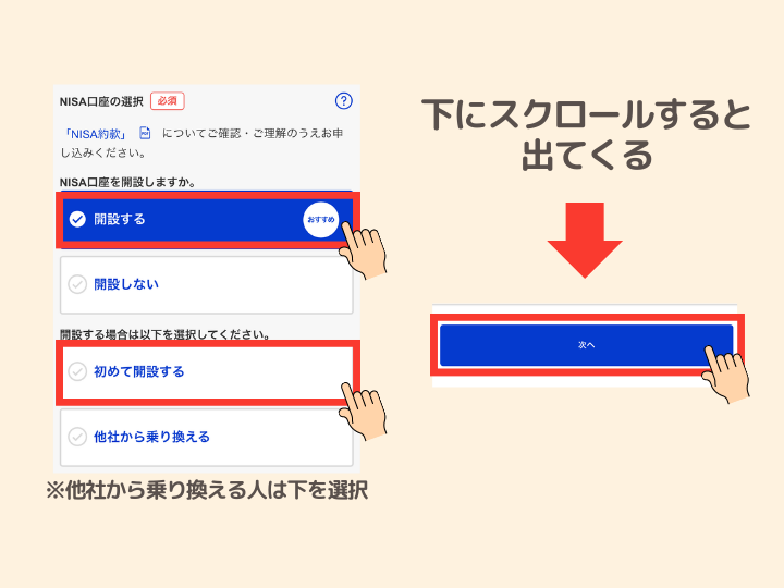 ❽NISA口座を「開設する」と、「初めて開設する(もしくは他社から乗り換える)」を選択し下にスクロールして「次へ」をタップ