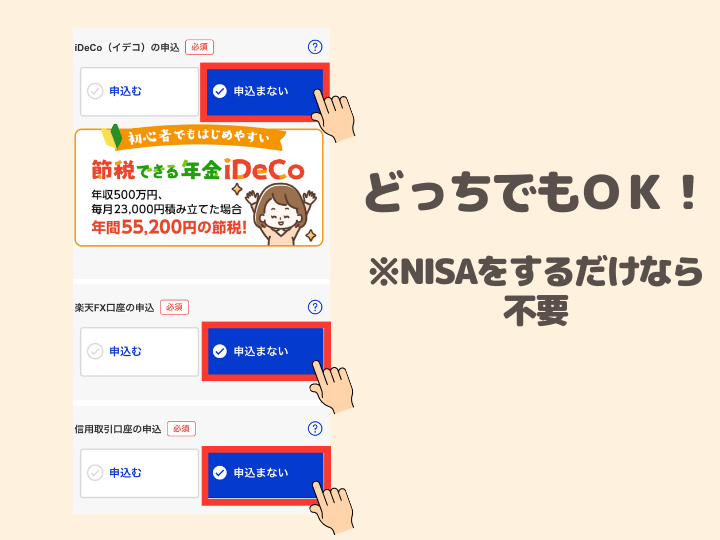 ❿iDeCo、楽天FX口座、信用取引口座はNISAをするだけなら「申し込まない」を選択