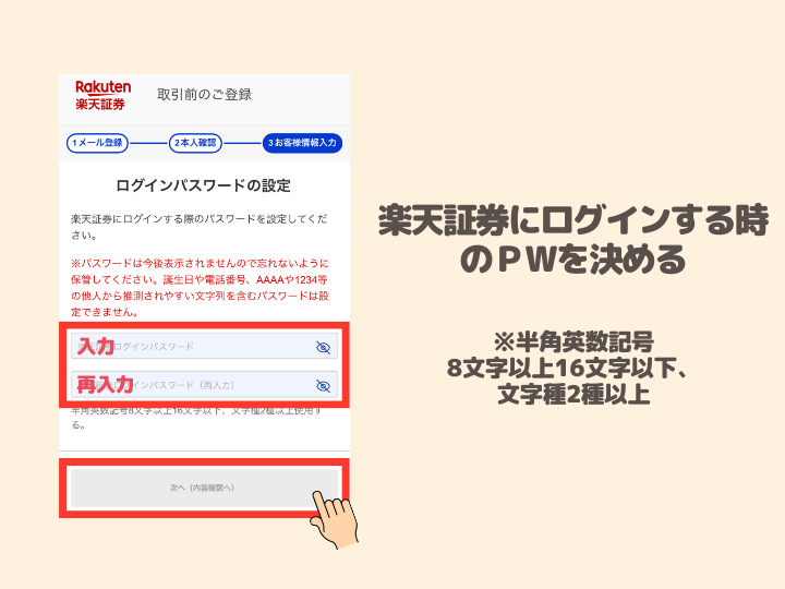 ⓫楽天証券にログインする為のパスワードを決めて入力、「次へ(内容確認へ)」をタップ