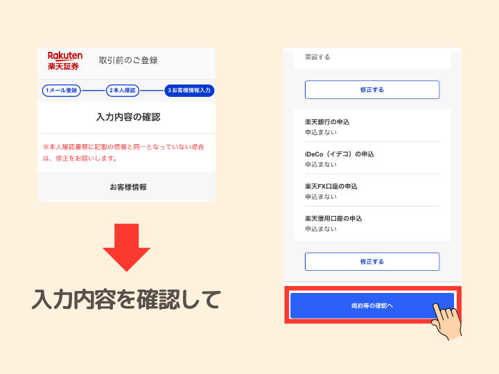 ⓬入力内容を確認し、「規約等の確認へ」をタップ