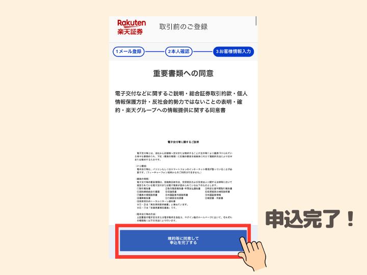 ⓭書類に目を通して、「規約等に同意して申込を完了する」をタップして申込完了!