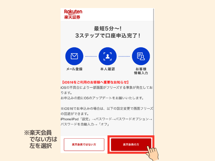 ❷既に楽天会員の人は「楽天会員の方」をタップ