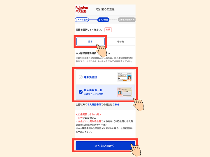 ❹国籍「日本」を選択し、本人確認書類を選択後、「次へ」をタップ