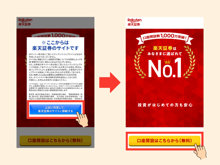 楽天証券の口座開設はこちら(公式HPを開く)❶「上記に同意して、楽天証券のサイトに移動する」をタップし、「口座開設はこちらから(無料)」をタップ