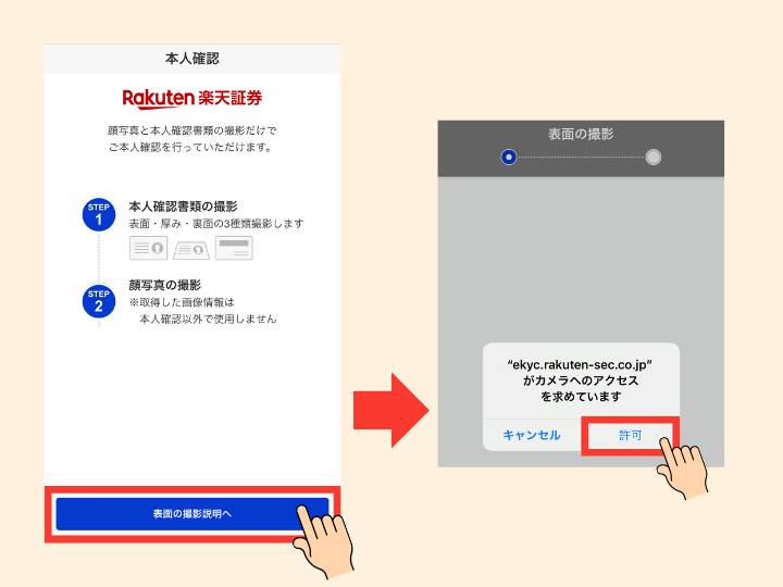 ❺「表面の撮影説明へ」をタップし、カメラへのアクセスを「許可」後、画面に沿ってマイナンバーカードの撮影→自分の撮影をして本人確認をする