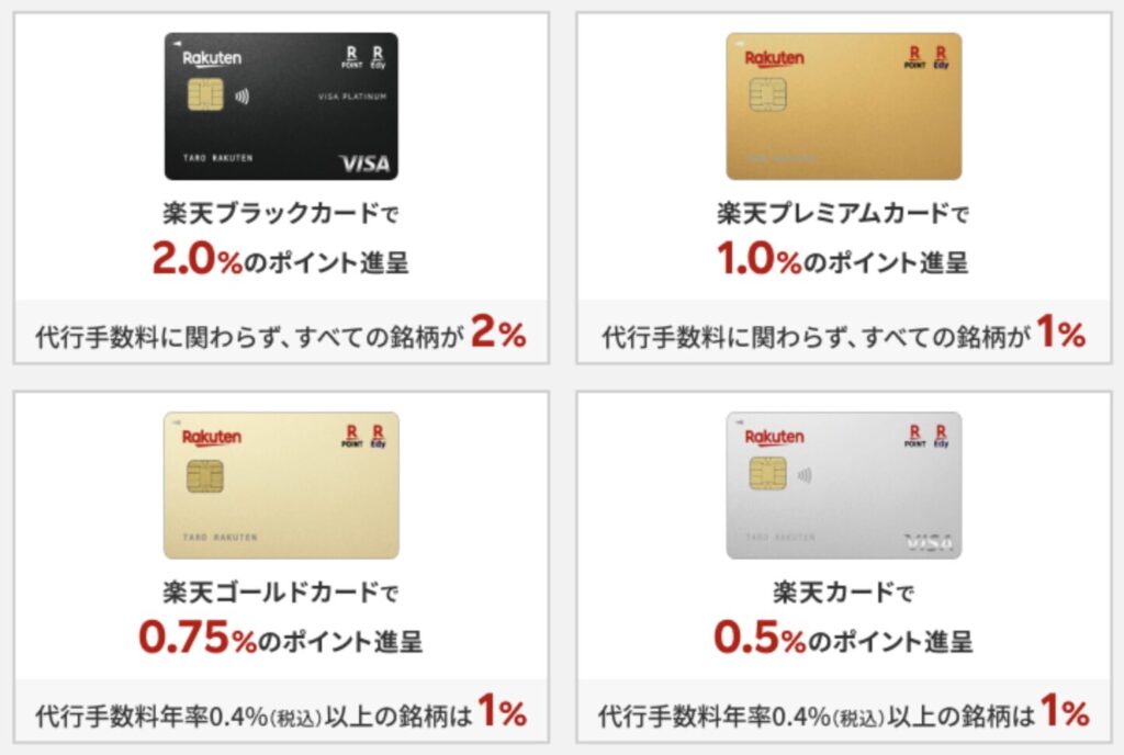 楽天カード以外は使えませんが年会費無料の一般カードであっても積立金額に0.5%ポイントが貯まる(最大2%もありますが、改悪などもありほとんどの人は一般カードを利用していると想定しています)ので、0.5%とはいえ長期投資をするうえではかなりの差になります。