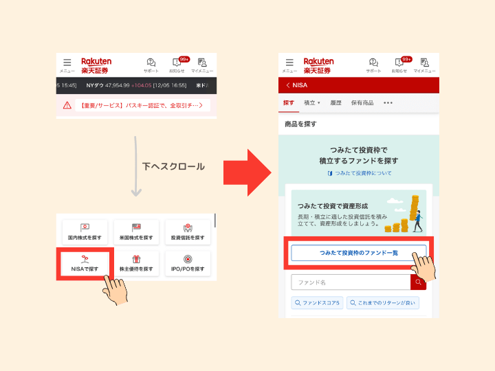 ①楽天証券にログインしたら少し下へスクロールして「NISAで探す」をタップ
