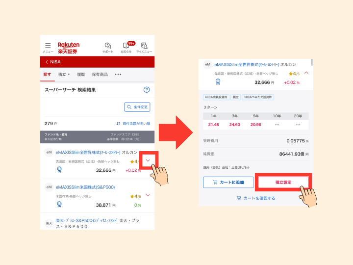 ③「これにしよう」と決まったら、銘柄の横の三角を開くと出てくる「積立設定」 をタップ