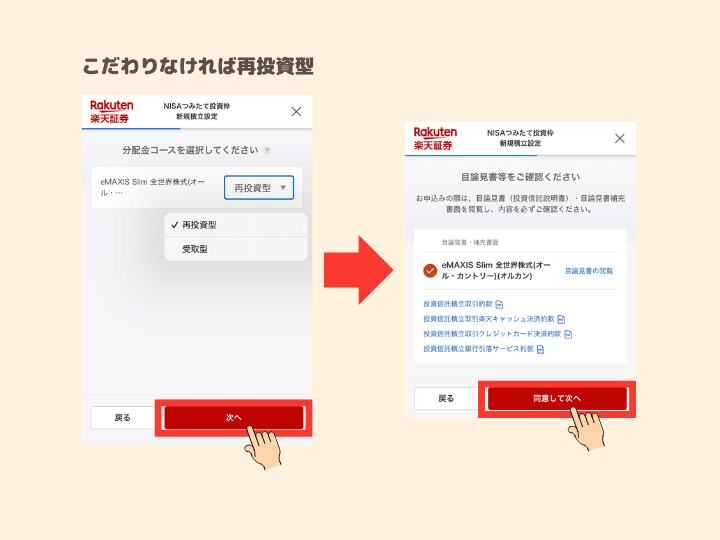 ⑤こだわりがなければ「再投資型」のまま「次へ」をタップ