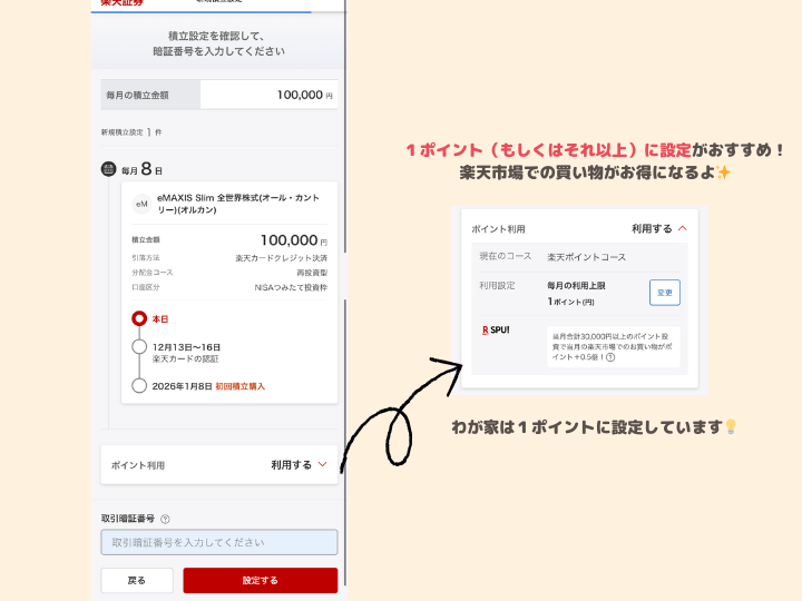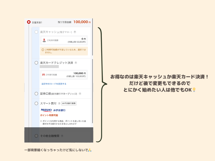 という方は、一旦「証券口座引落(現金)」で設定して、後からクレカ決済か楽天キャッシュ決済に変更でもOKです。