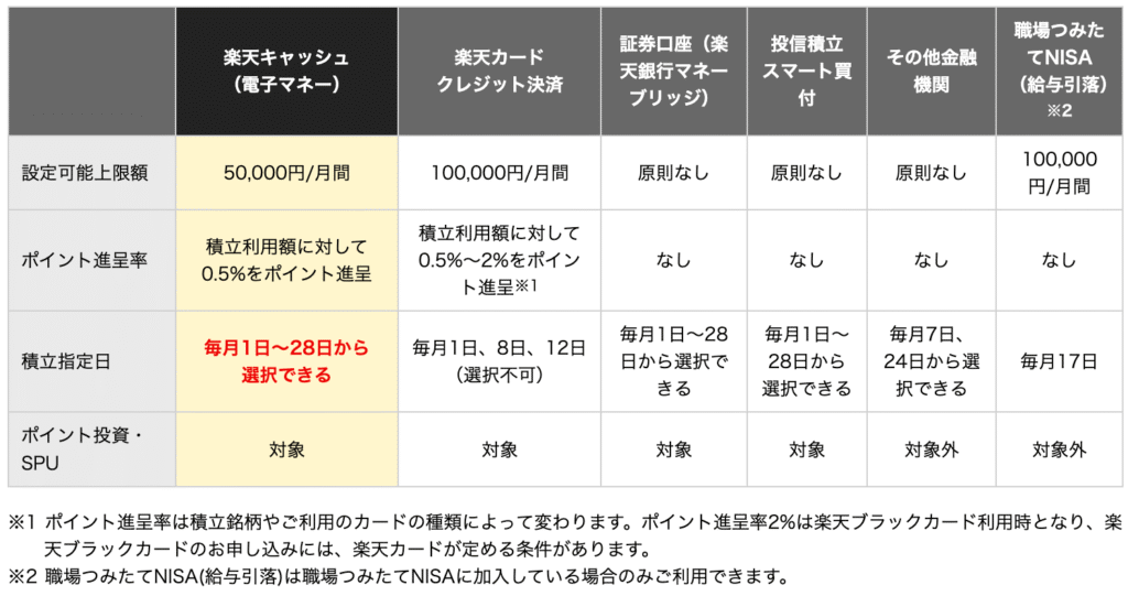 楽天証券で積立をする場合、楽天カードか楽天キャッシュでのクレカ積立が一番お得です。